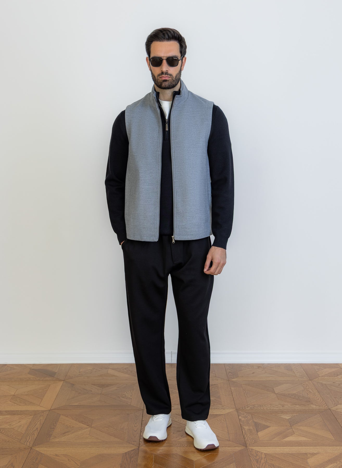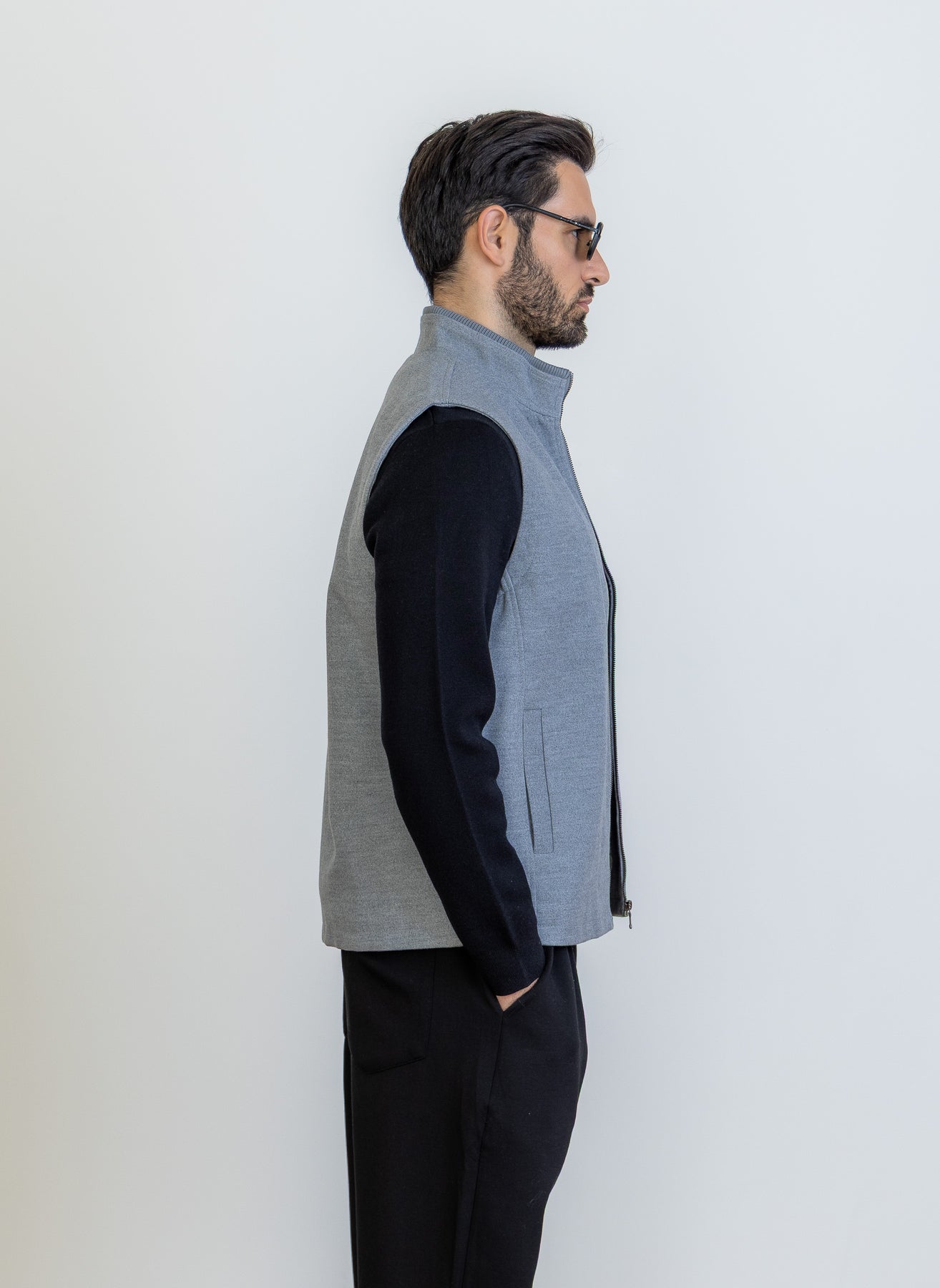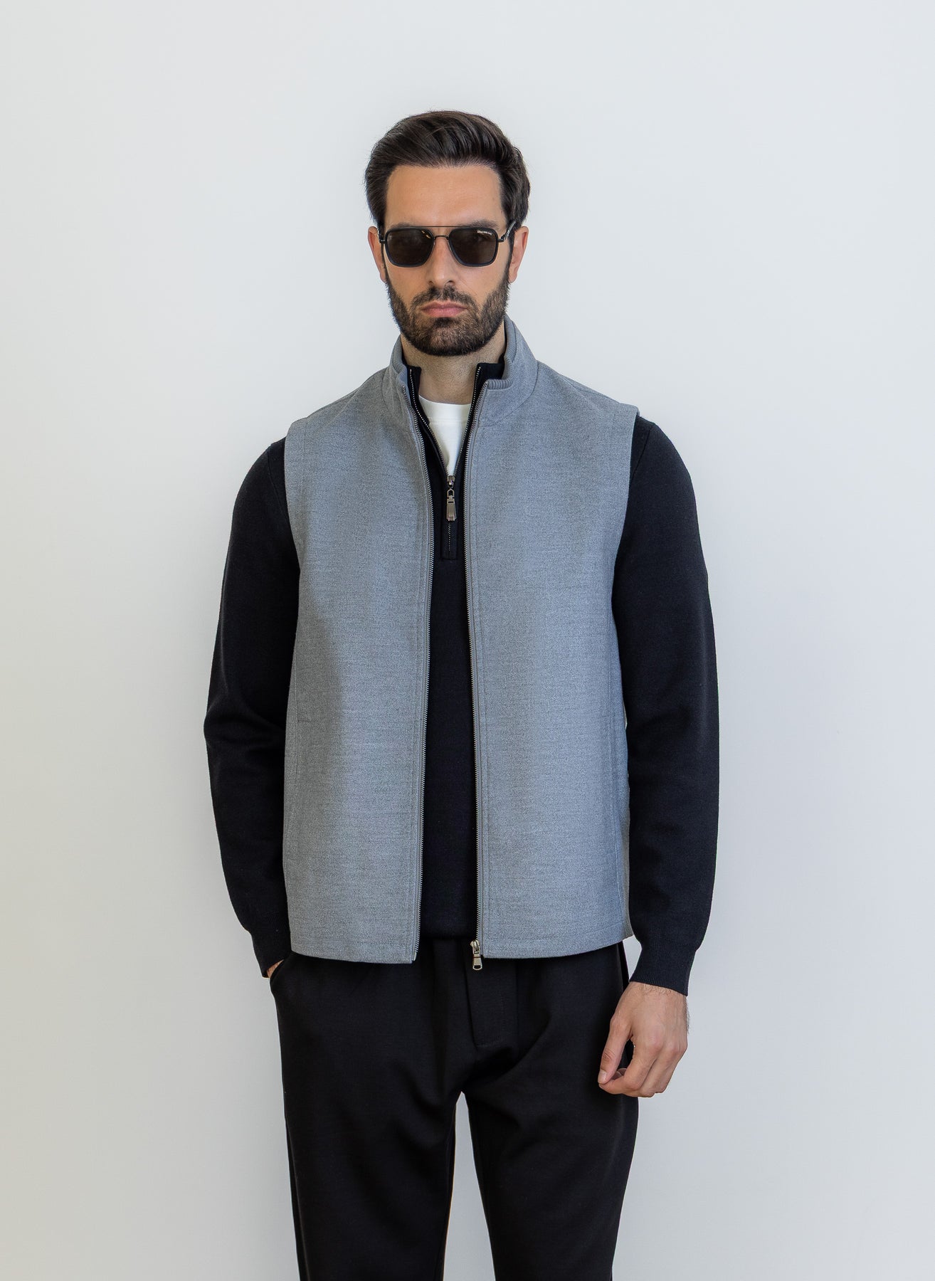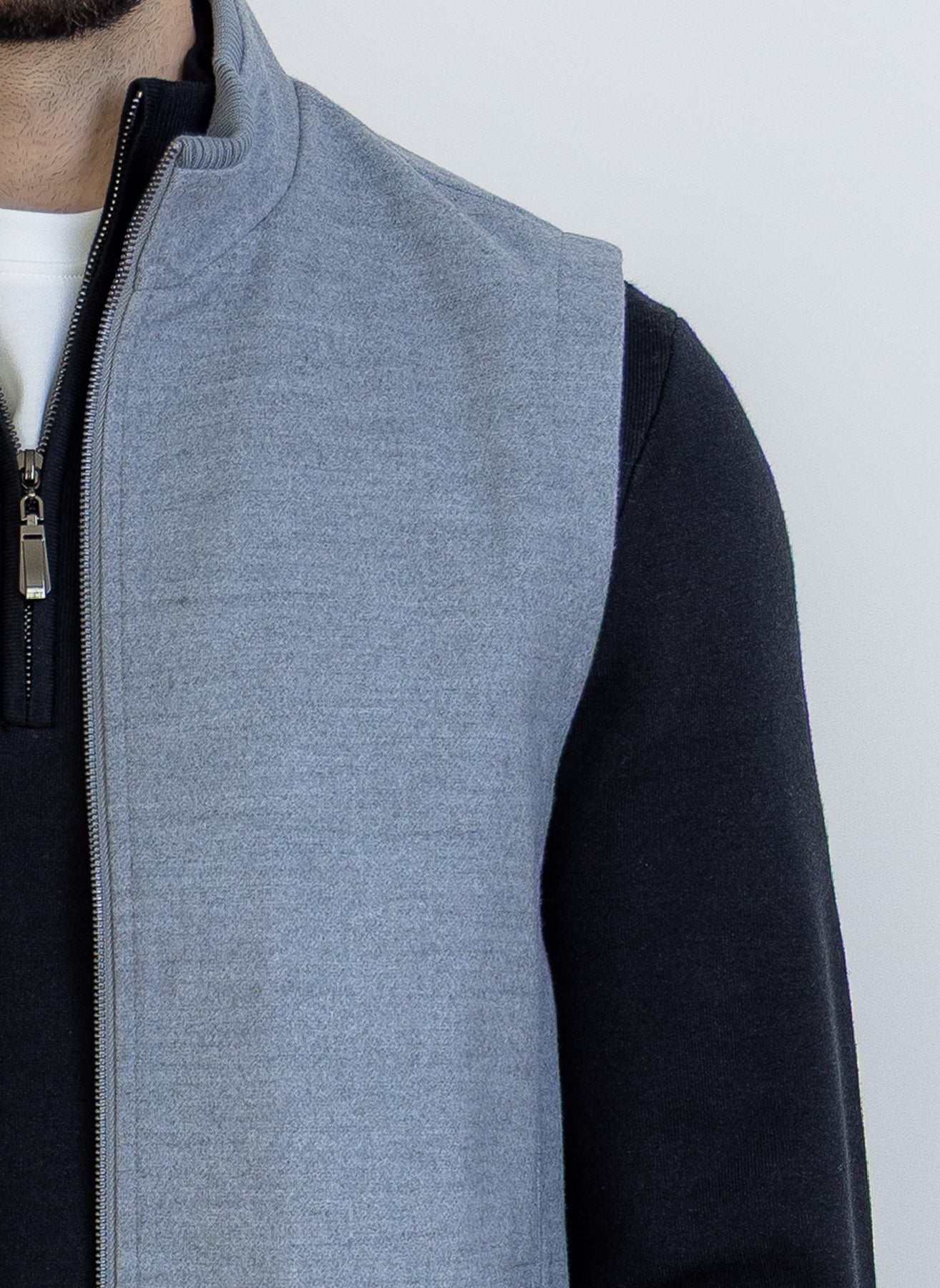 A textured wool blend gilet offering refined warmth and versatile layering.
