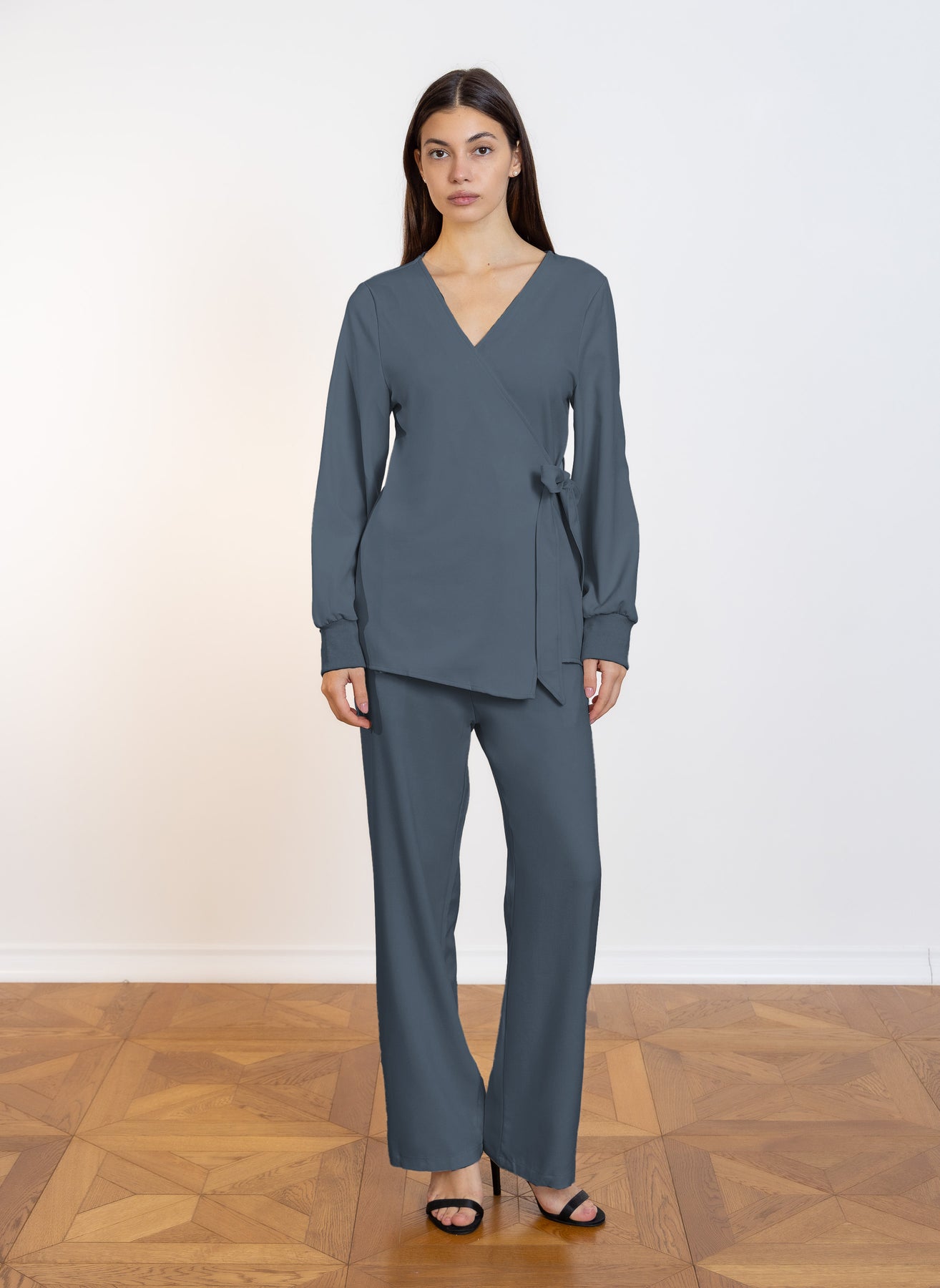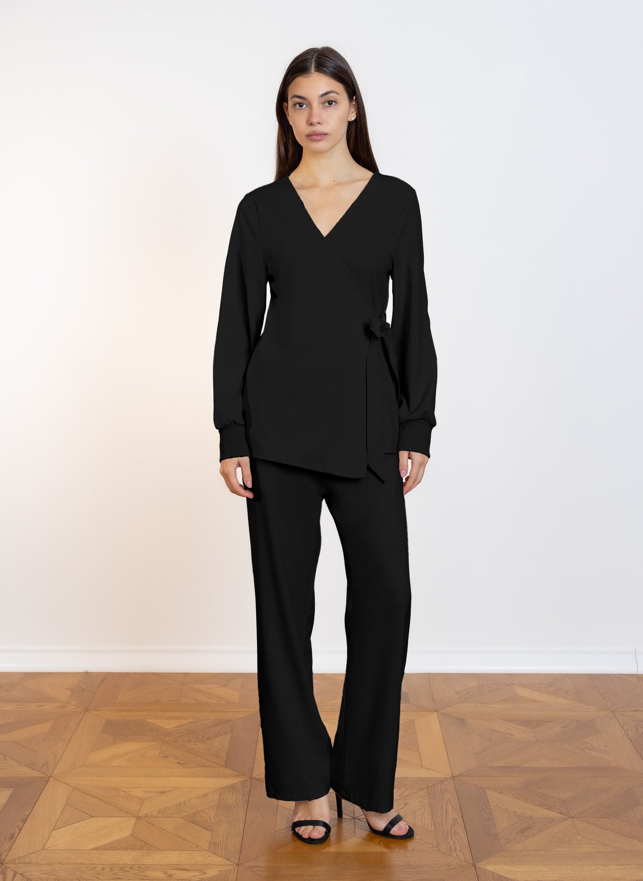 Soft wrap top with bow paired with matching relaxed pants for effortless everyday elegance.