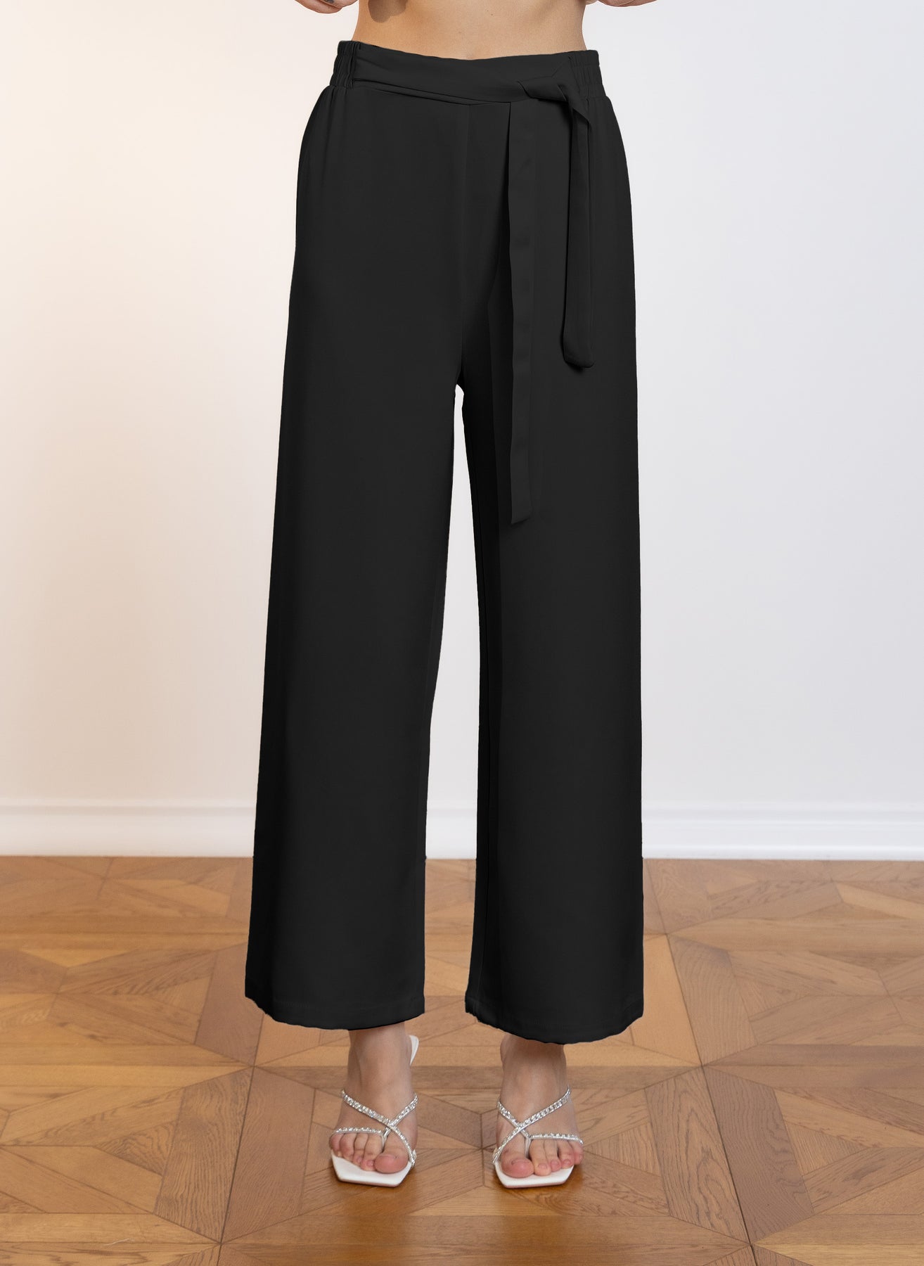 Elegant wide-leg trousers featuring a flattering fit with a soft bow-tie waist detail.