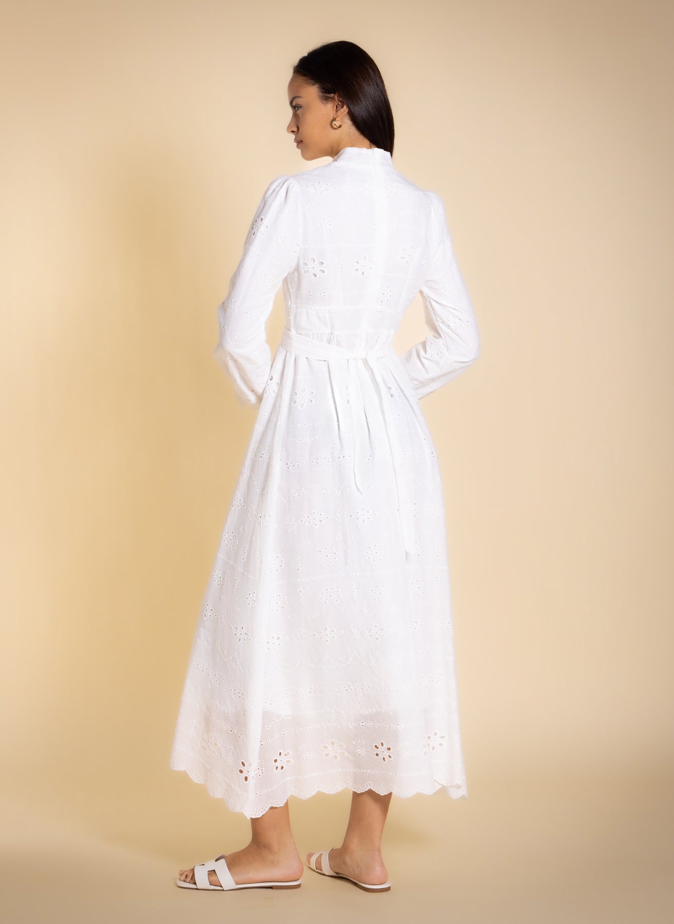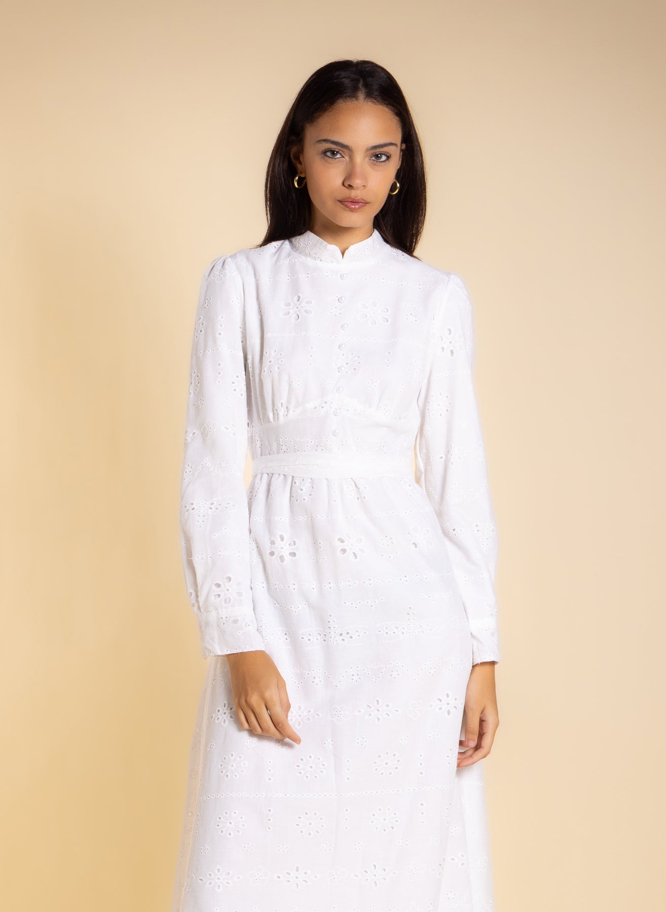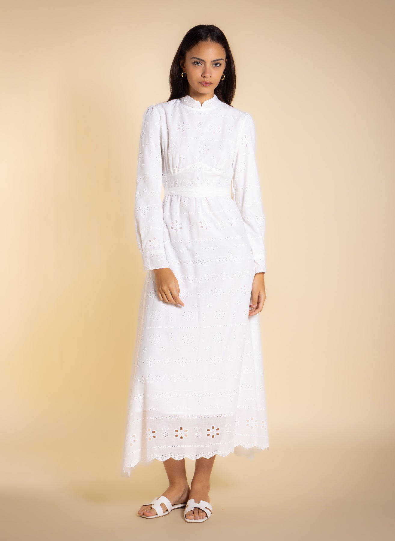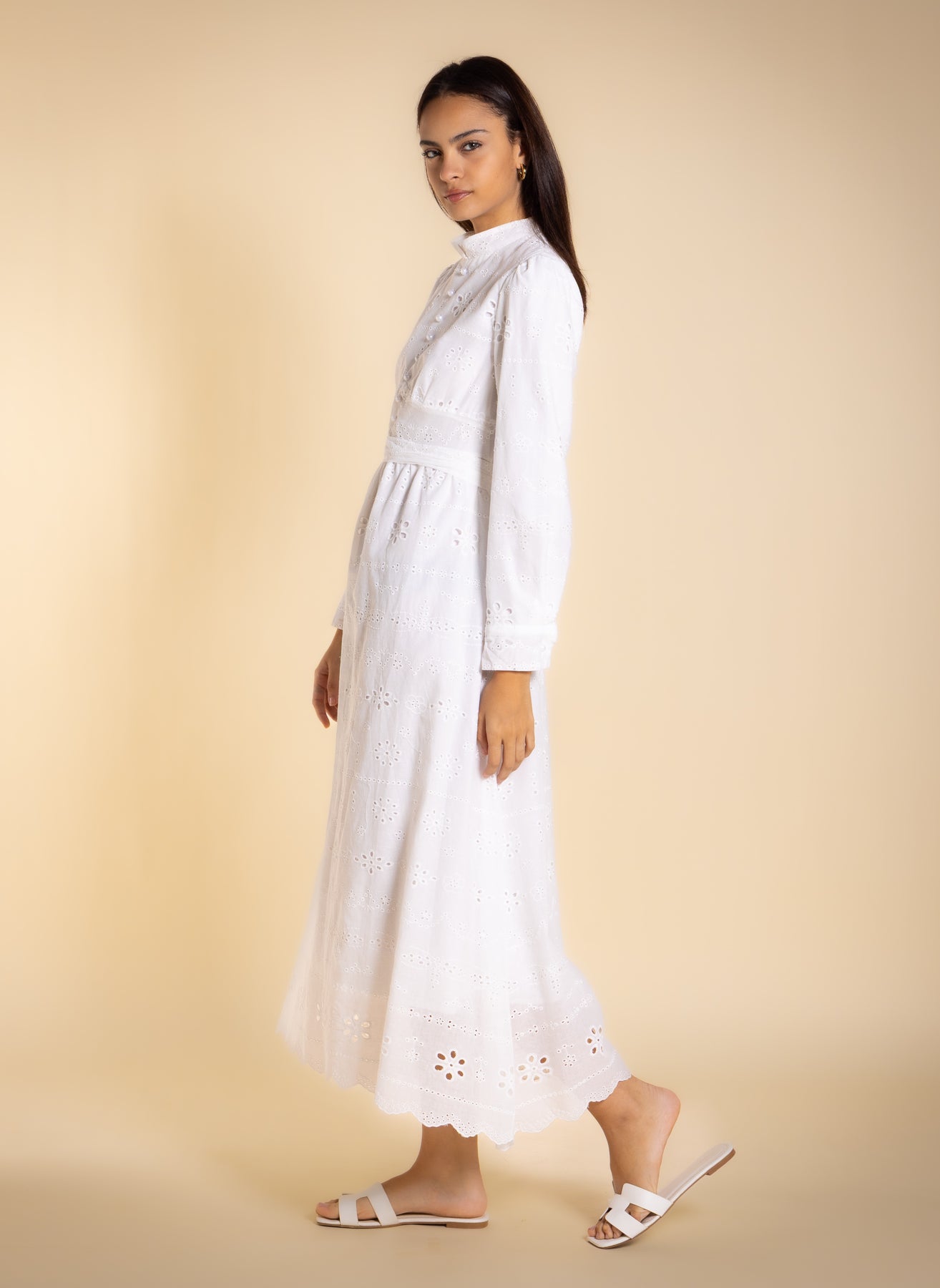 Elegant embroidered cutwork midi dress in breathable cotton with inner lining, long sleeves, and matching belt for comfortable and refined everyday or occasion wear.