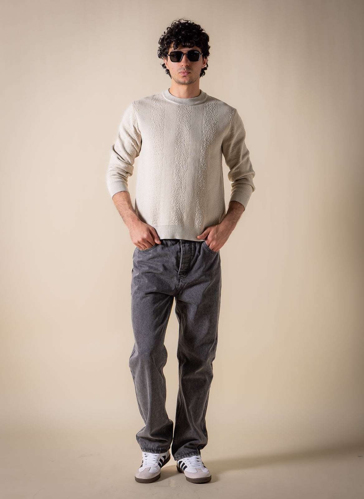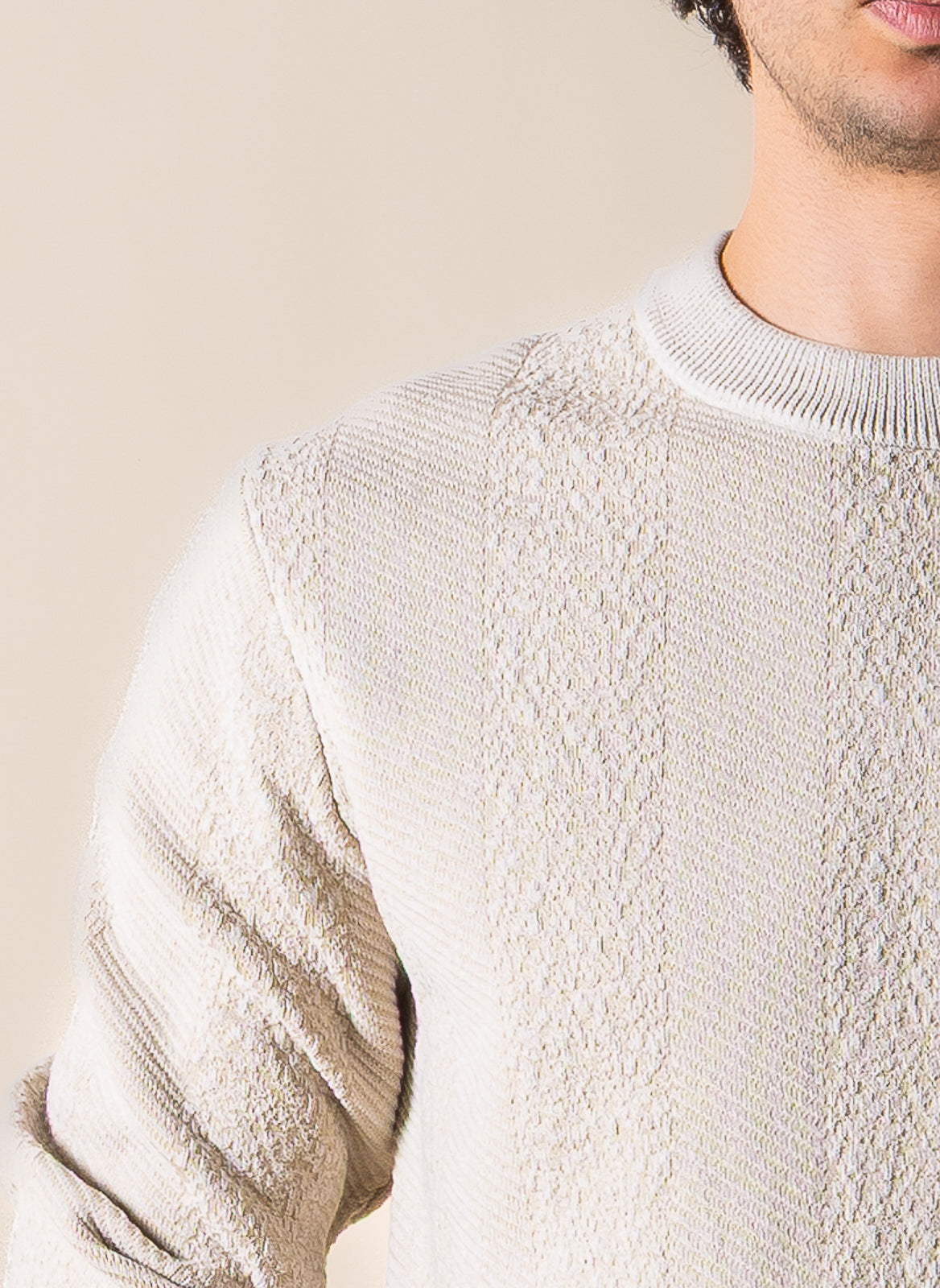 Distinctive textured weave creates visual depth and tactile interest in classic jumper silhouette