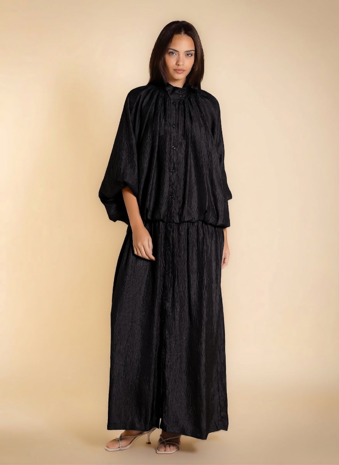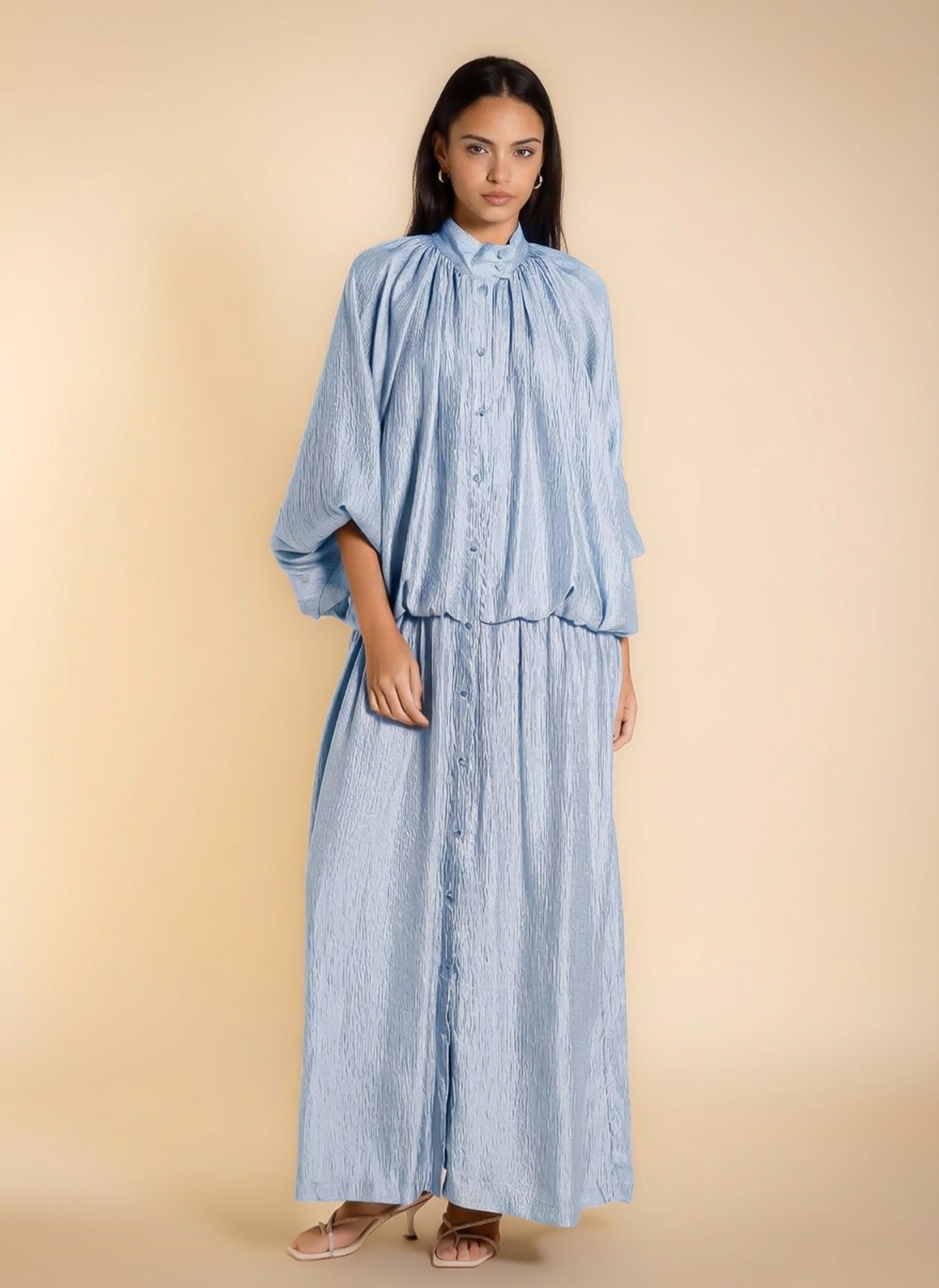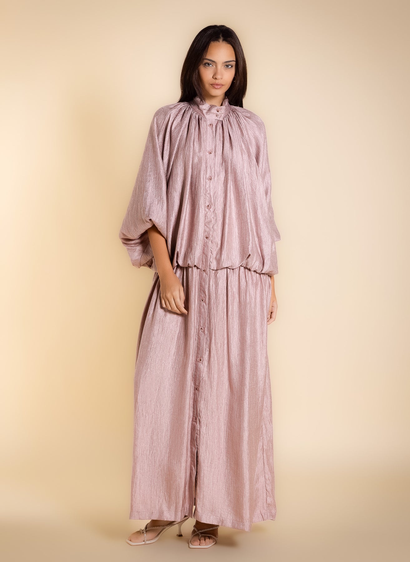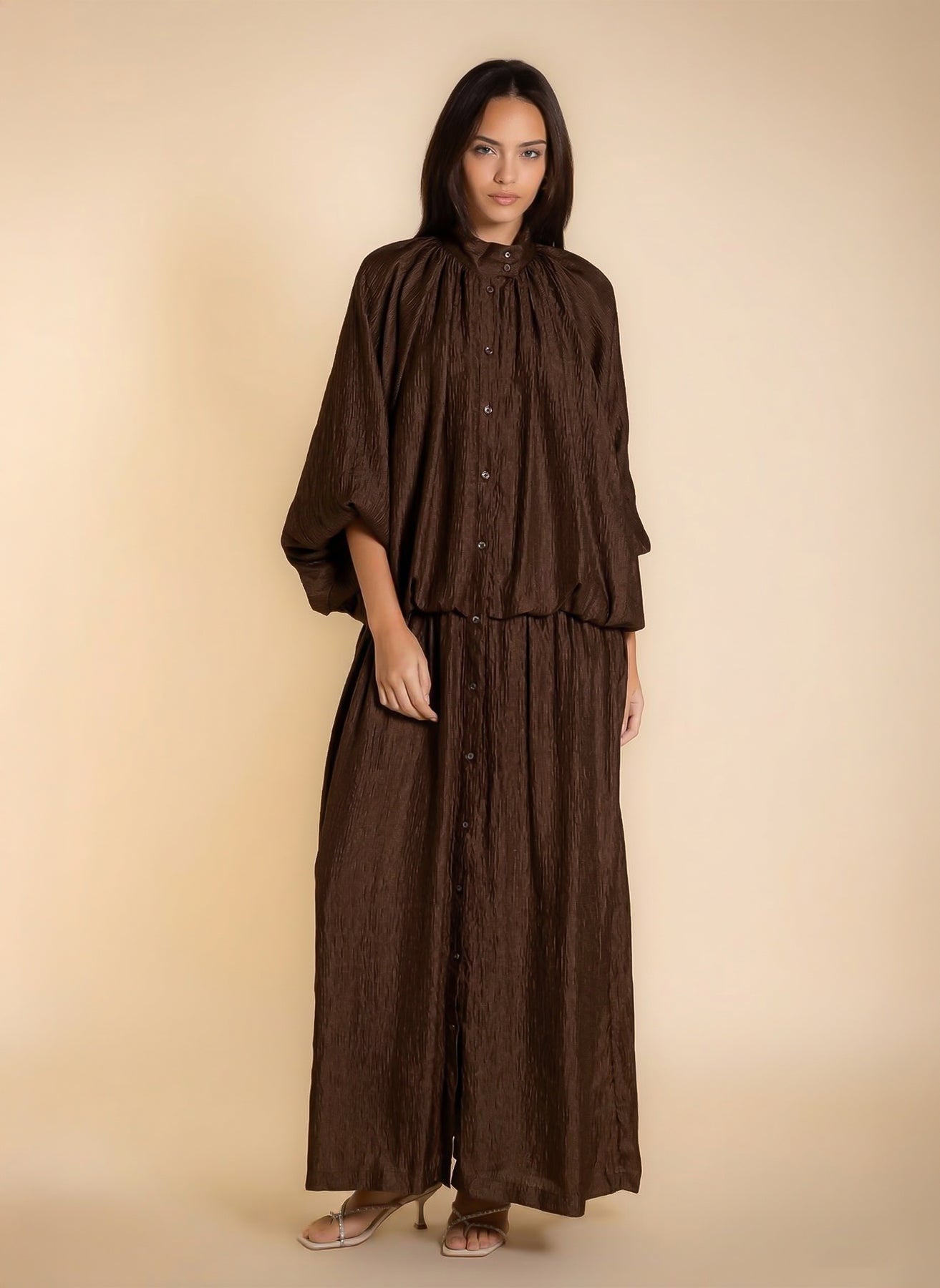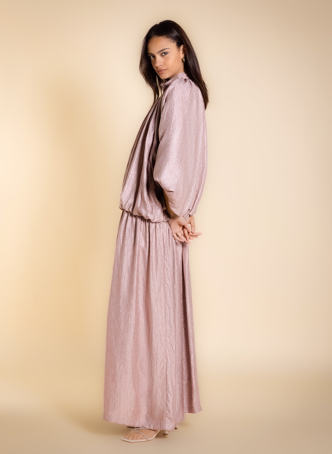 Shiny textured maxi dress with soft inner lining and long sleeves, designed in flowing lightweight fabric for elegant modest styling .