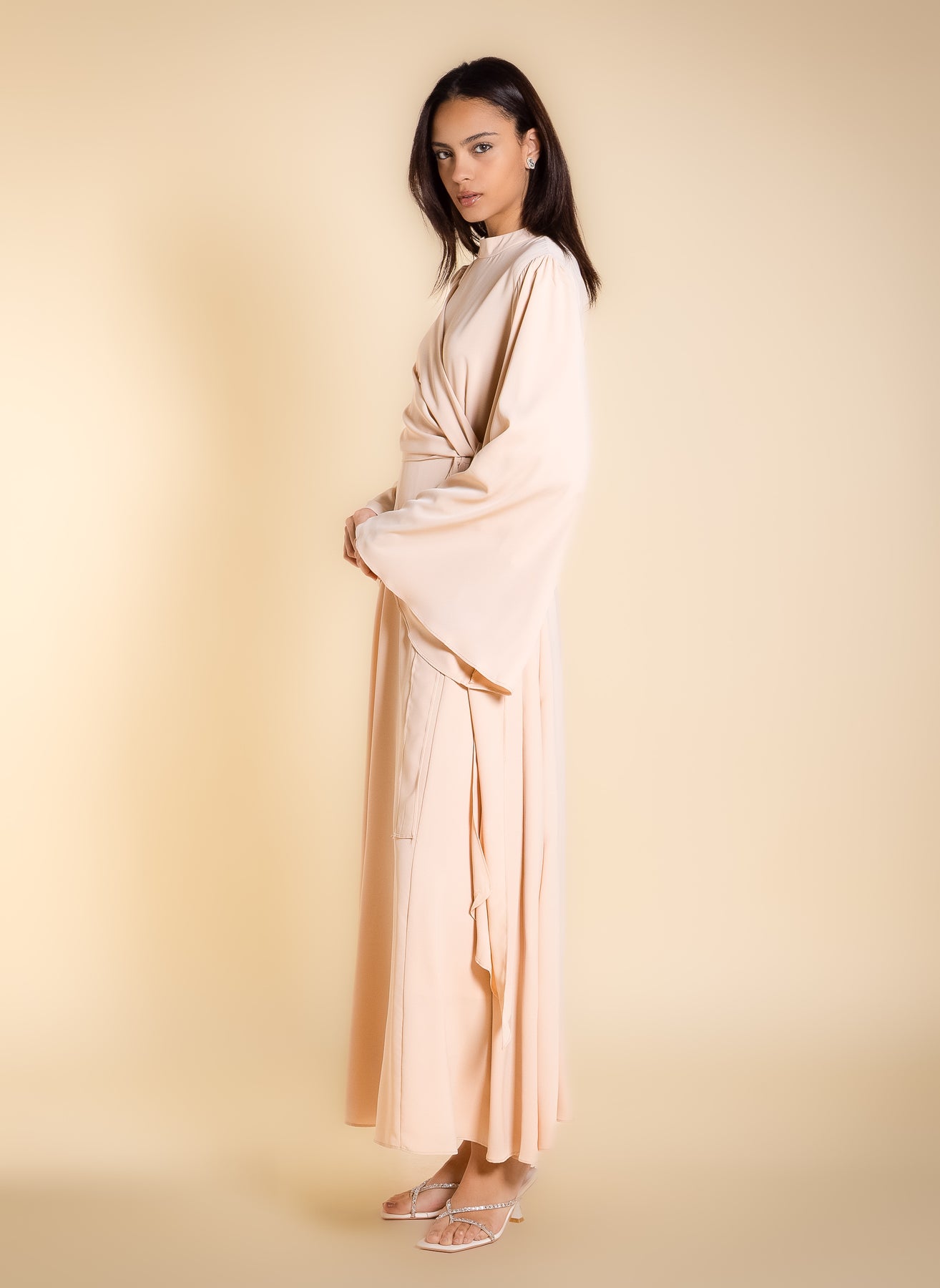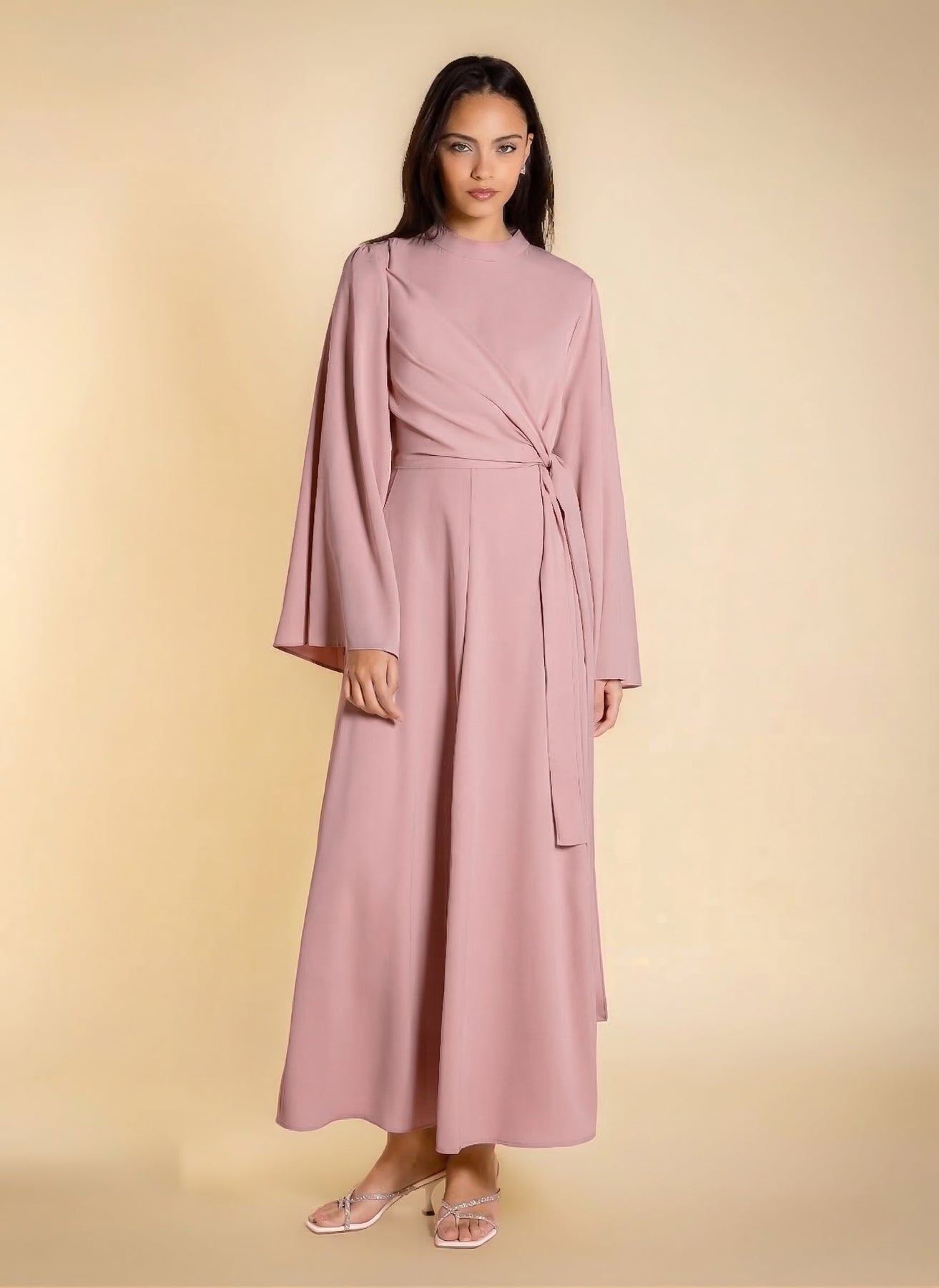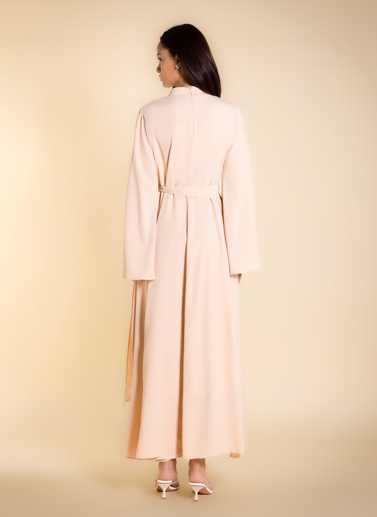 Elegant maxi chiffon dress with high neck, long sleeves, and matching belt, designed in a lightweight flowing shape perfect for formal and evening wear.