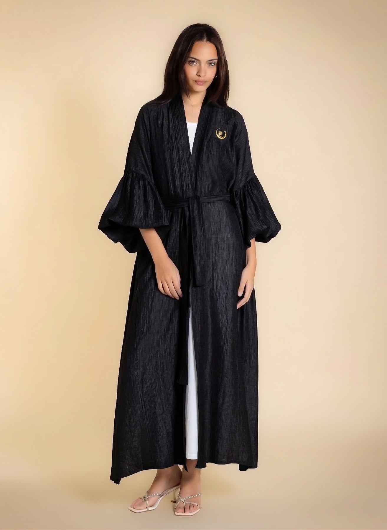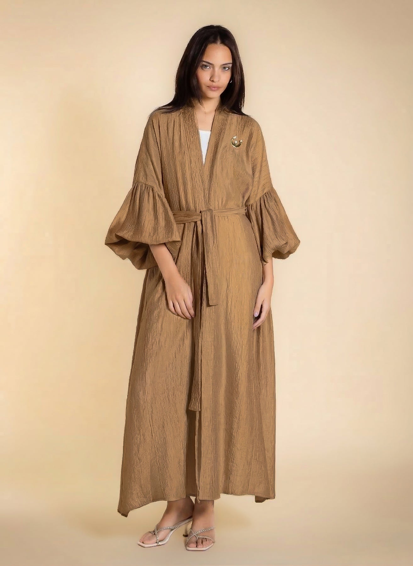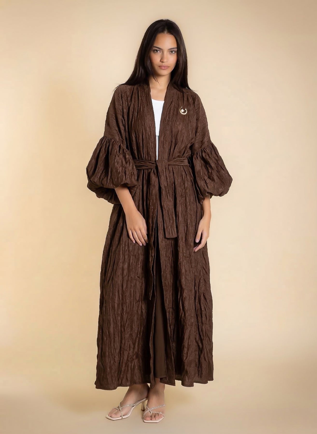 Shiny textured long abaya with puff sleeves and matching statement buckle belt, designed for elegant modest wear.