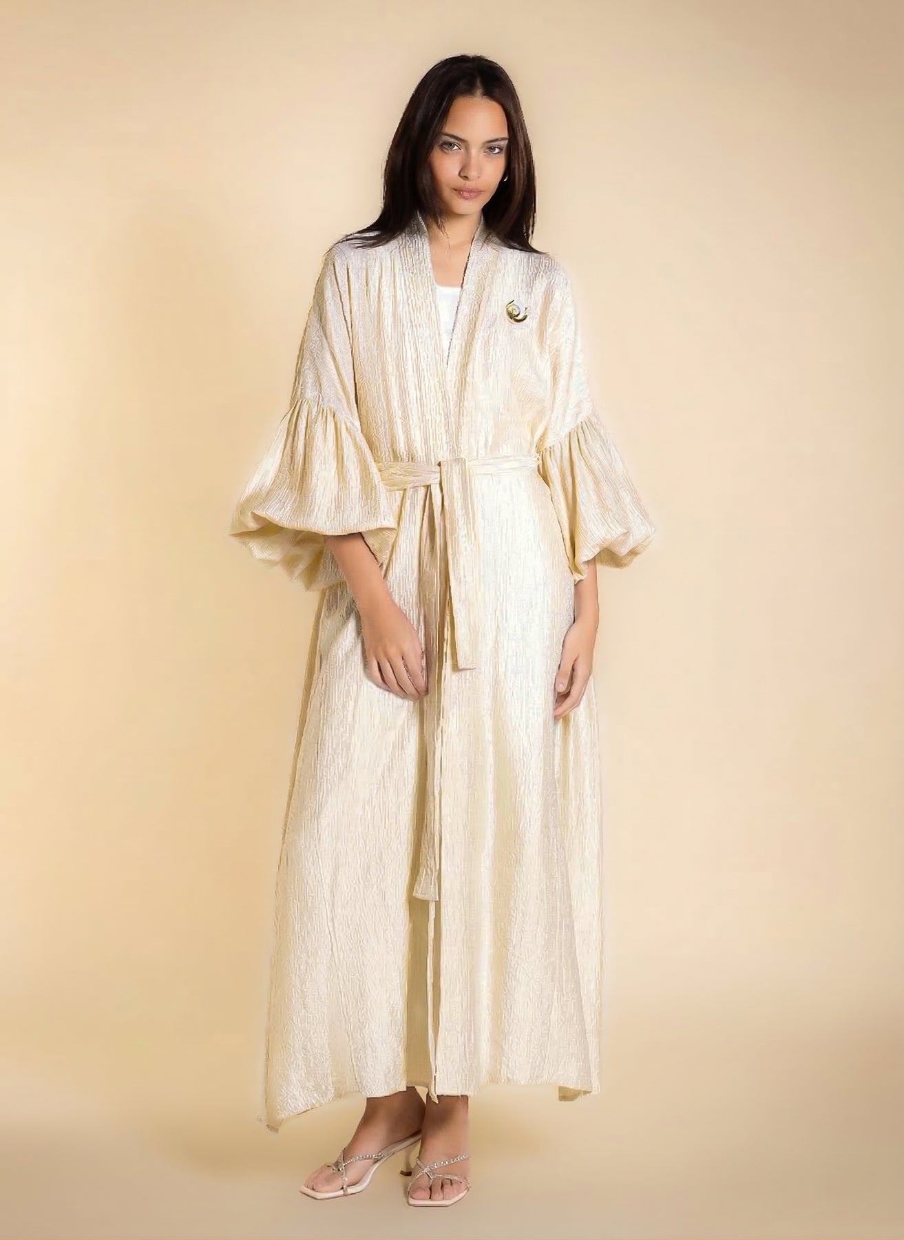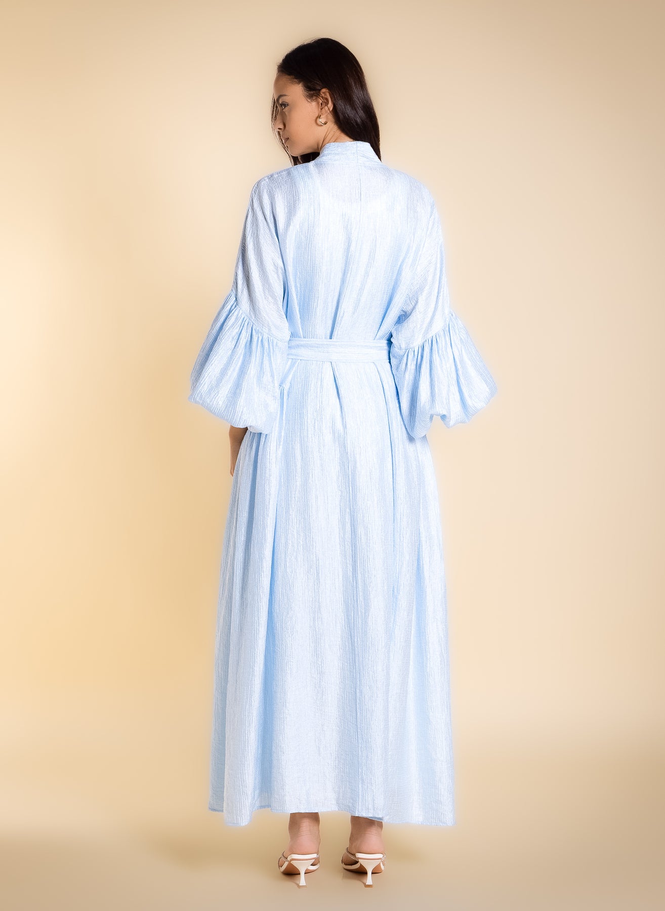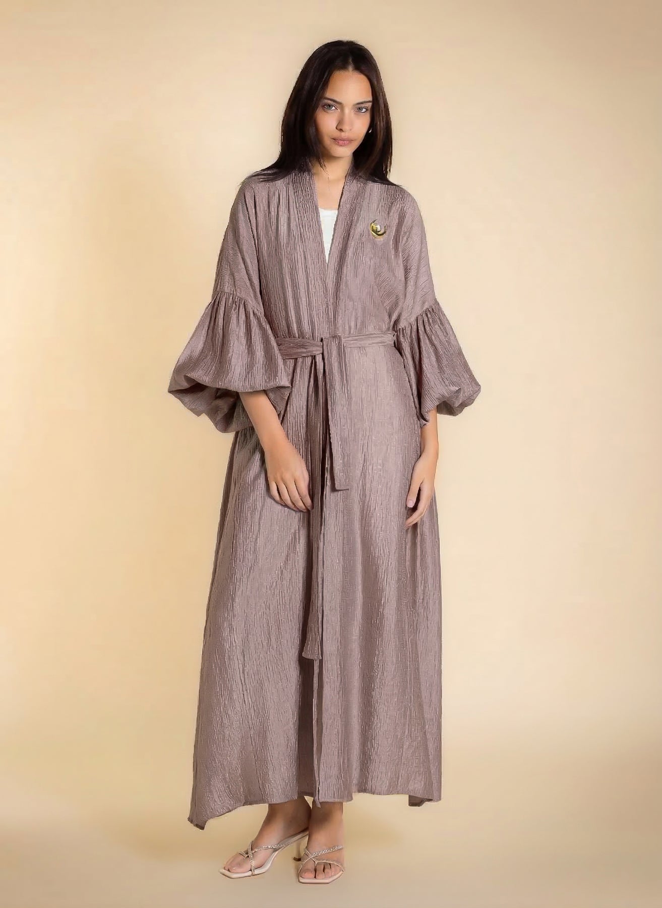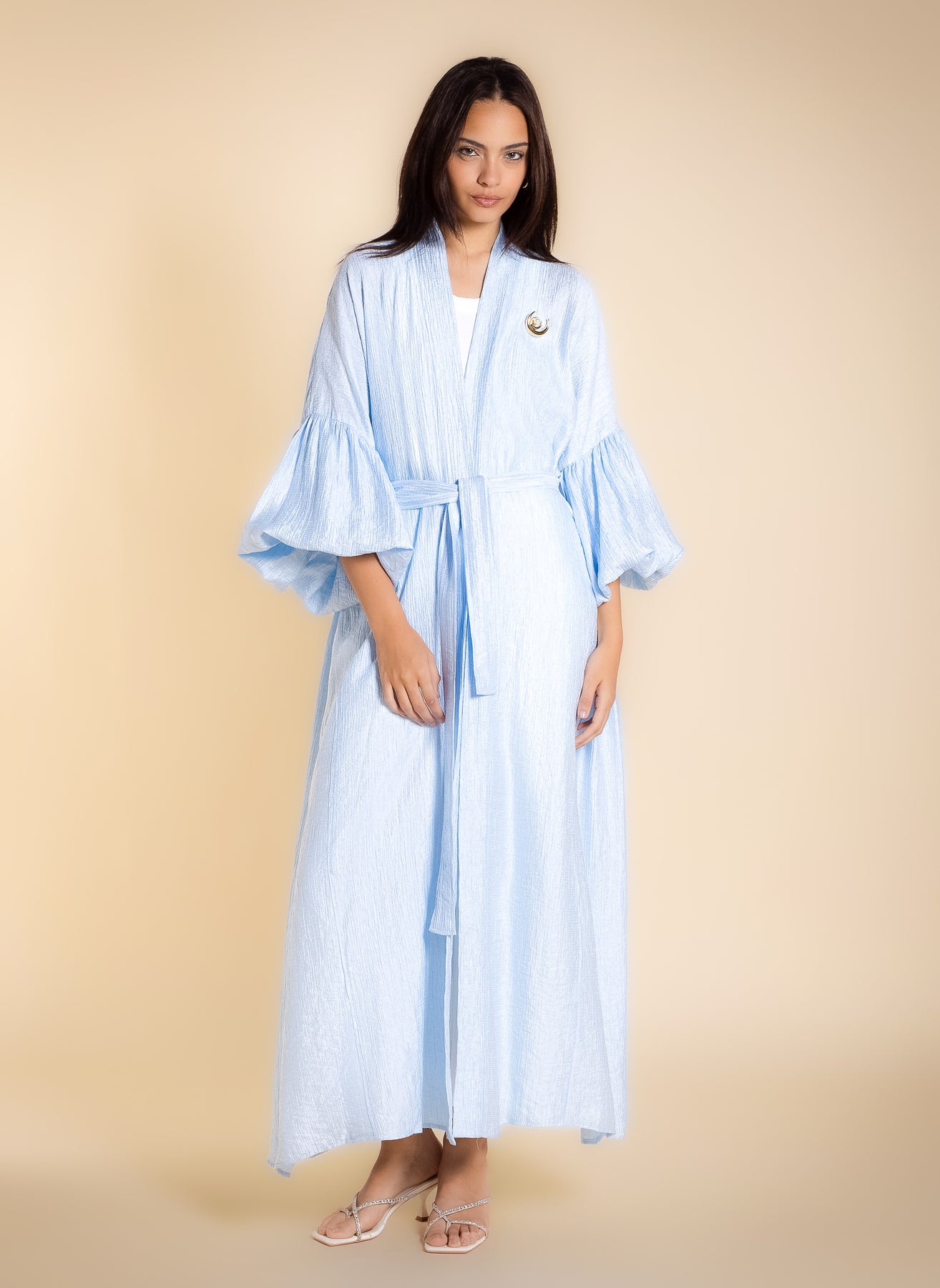 Shiny textured long abaya with puff sleeves and matching statement buckle belt, designed for elegant modest wear.