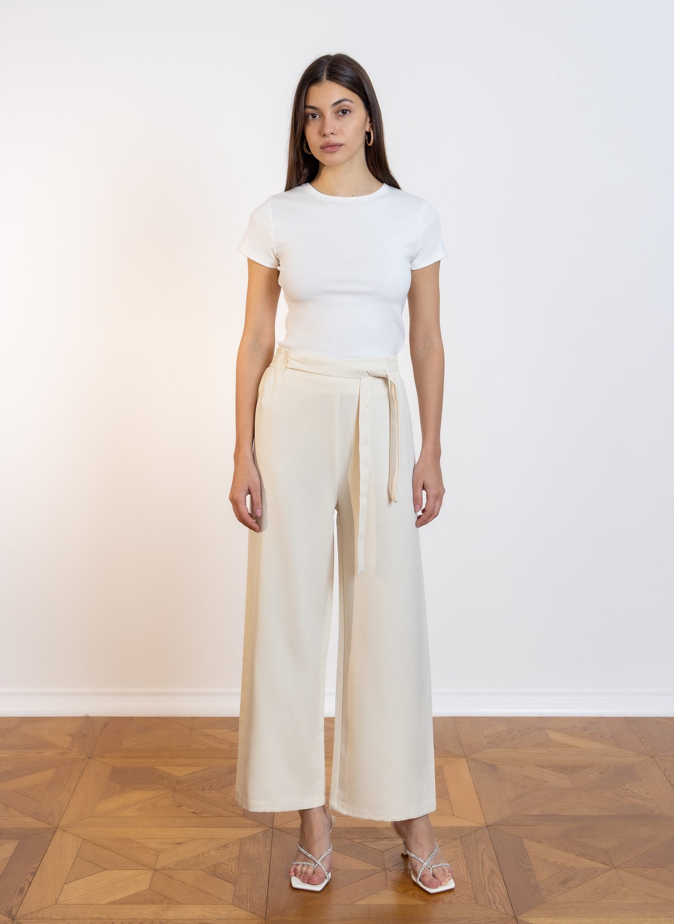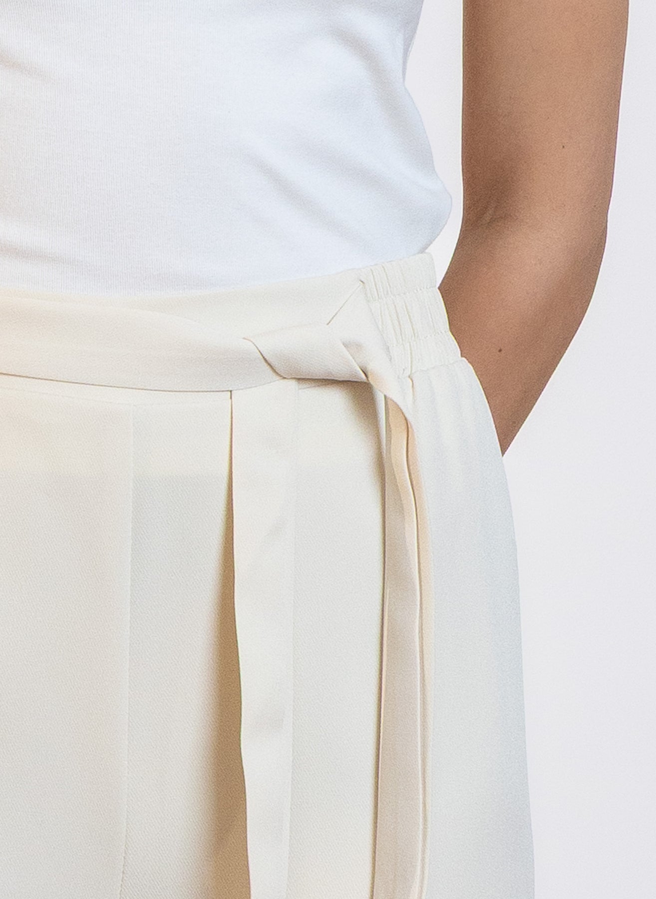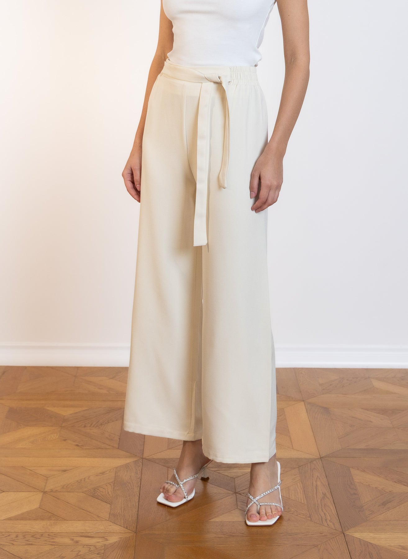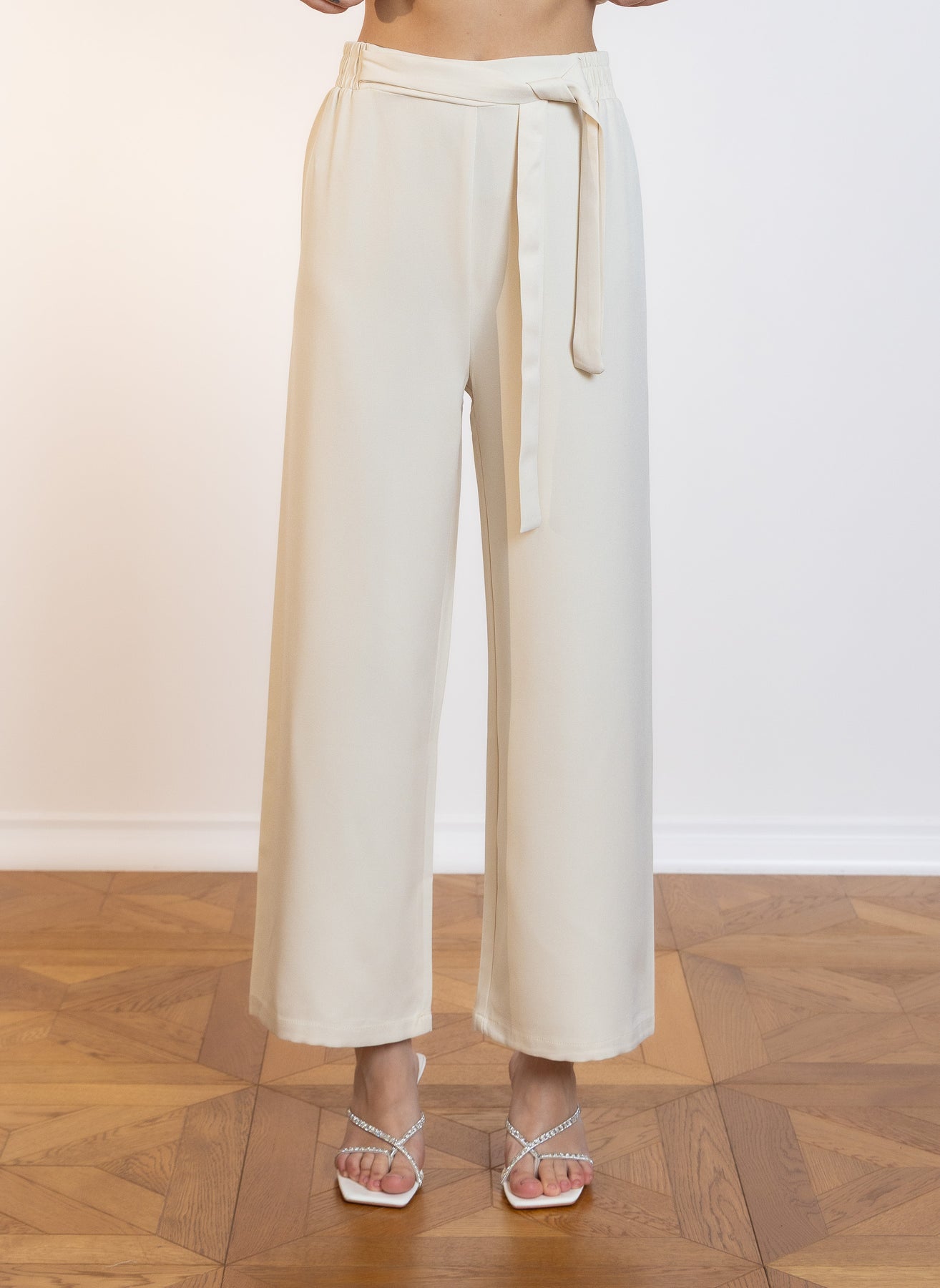Elegant wide-leg trousers featuring a flattering fit with a soft bow-tie waist detail.