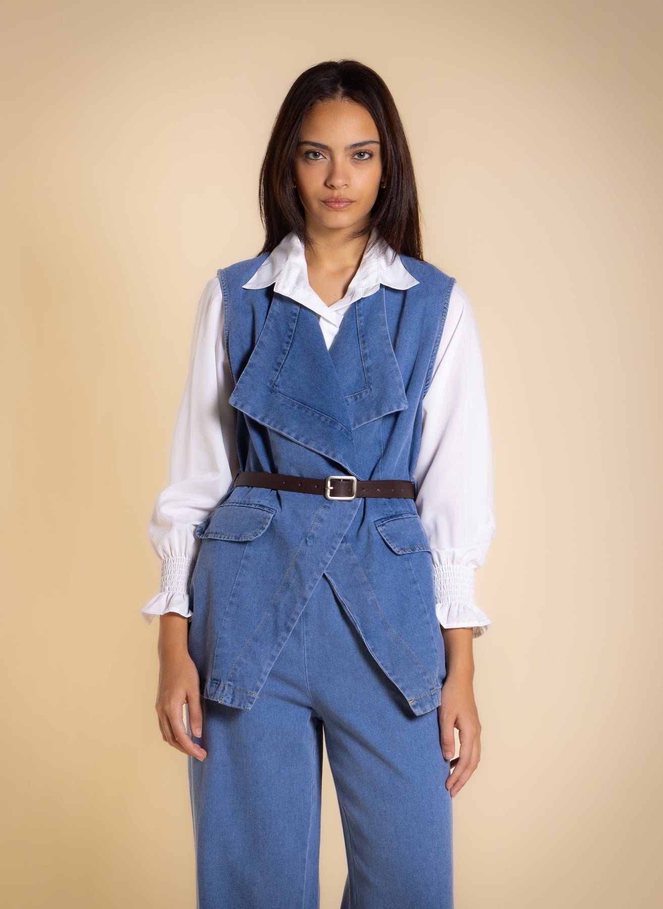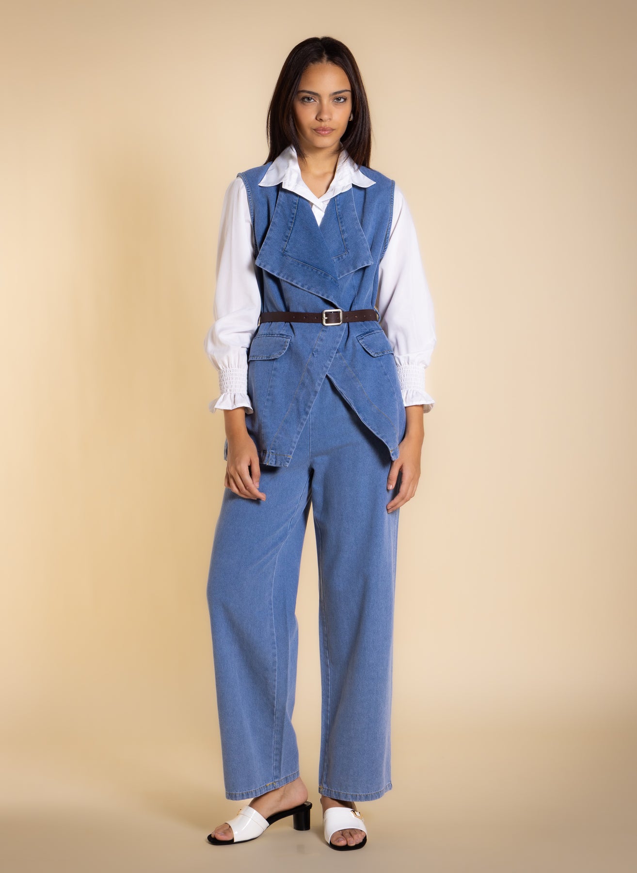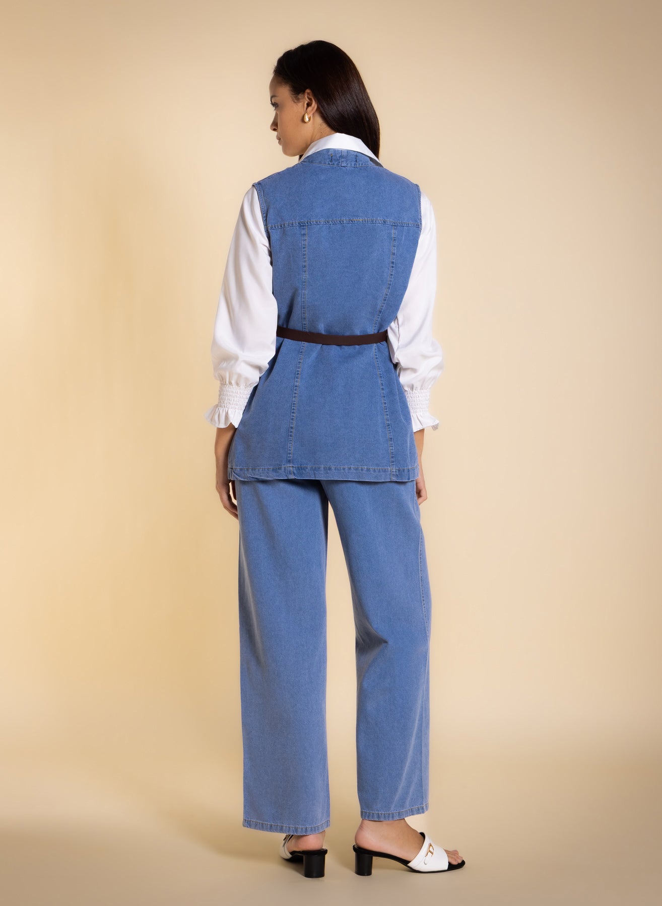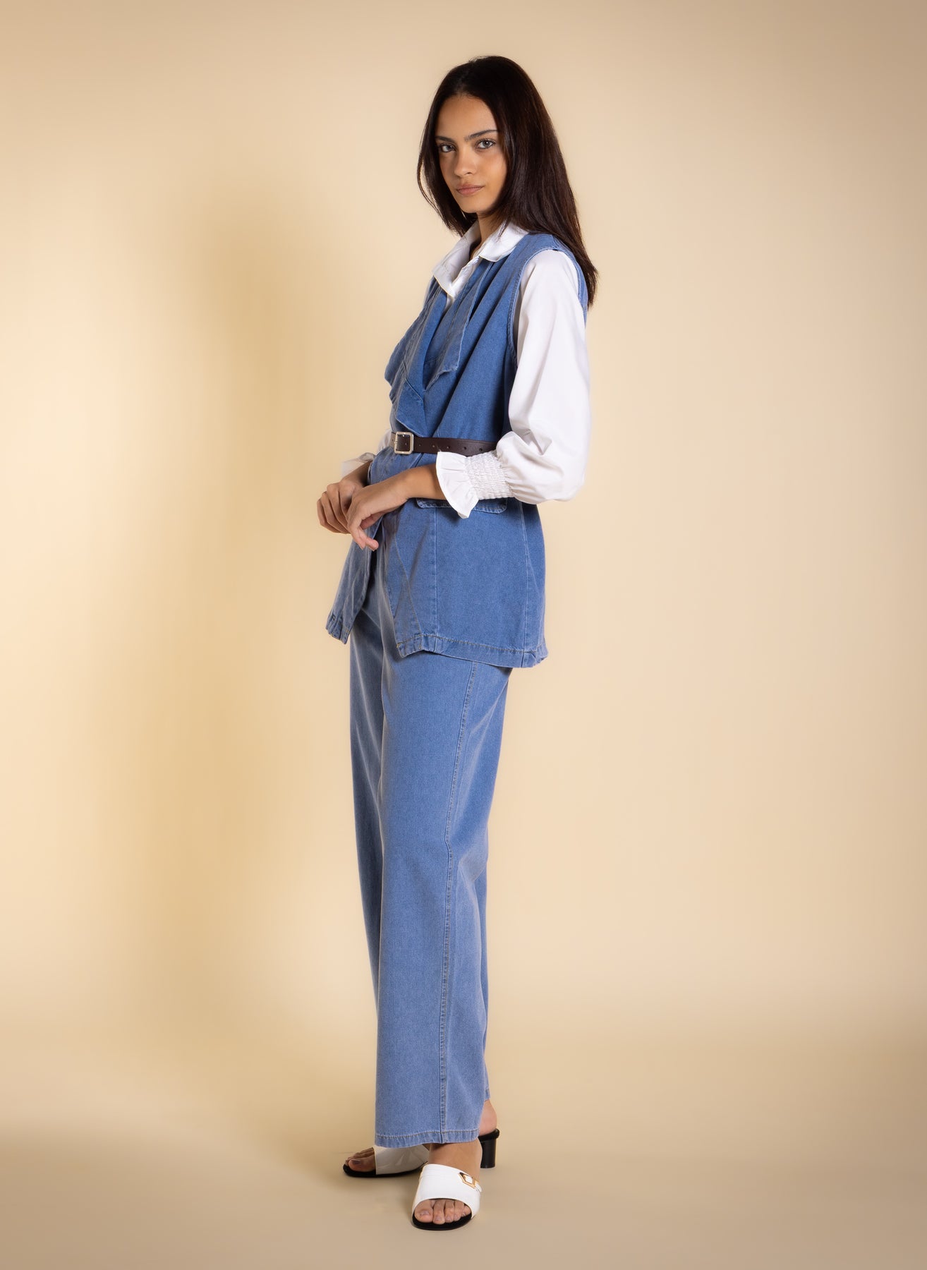 Soft denim 3-piece waistcoat set featuring matching elastic waistband pants and white shirt, crafted in comfortable breathable denim .