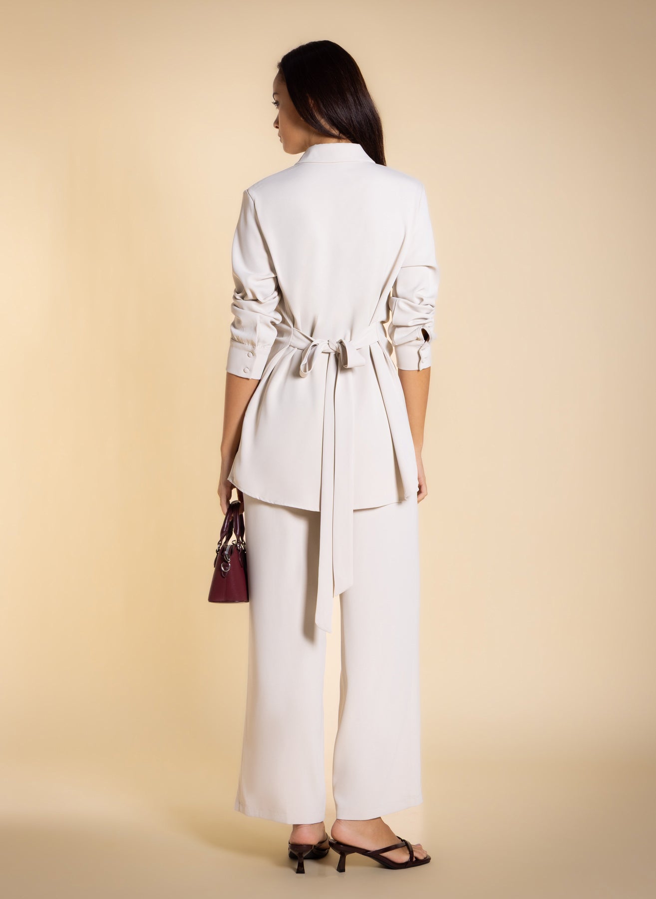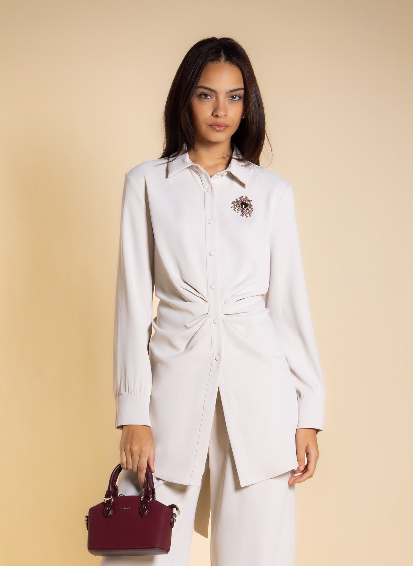 Detailed long sleeve shirt set with matching belt and detachable brooch, paired with elastic waistband pants for elegant styling.