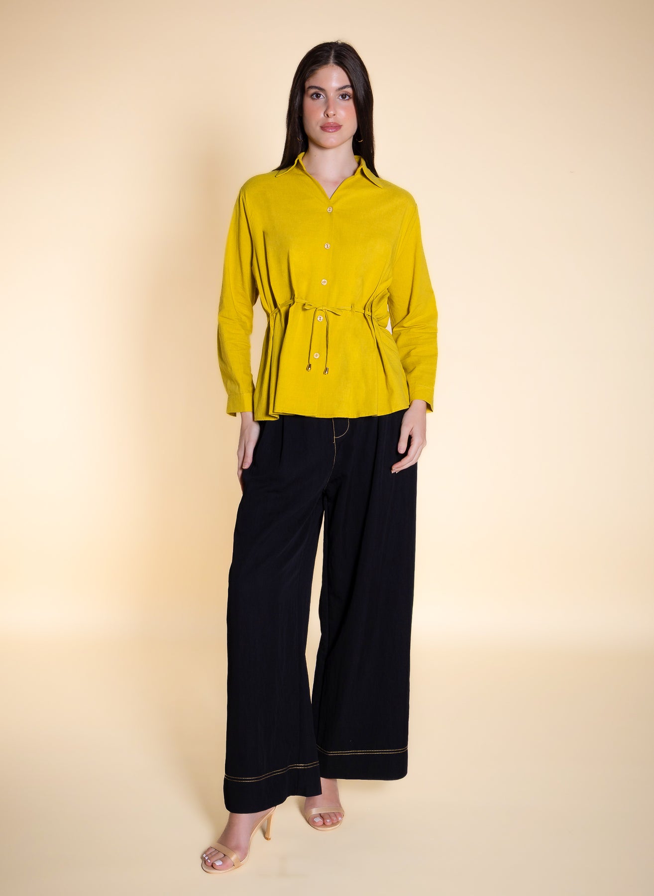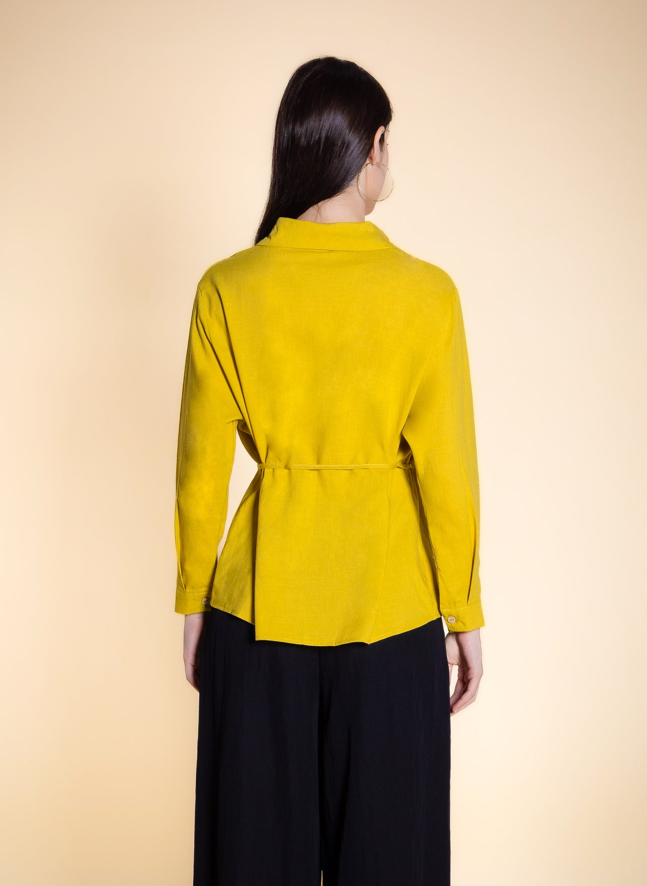 A breathable linen blend shirt with long sleeves, a flattering waist-tie, and matching thin belt for effortless, polished style.