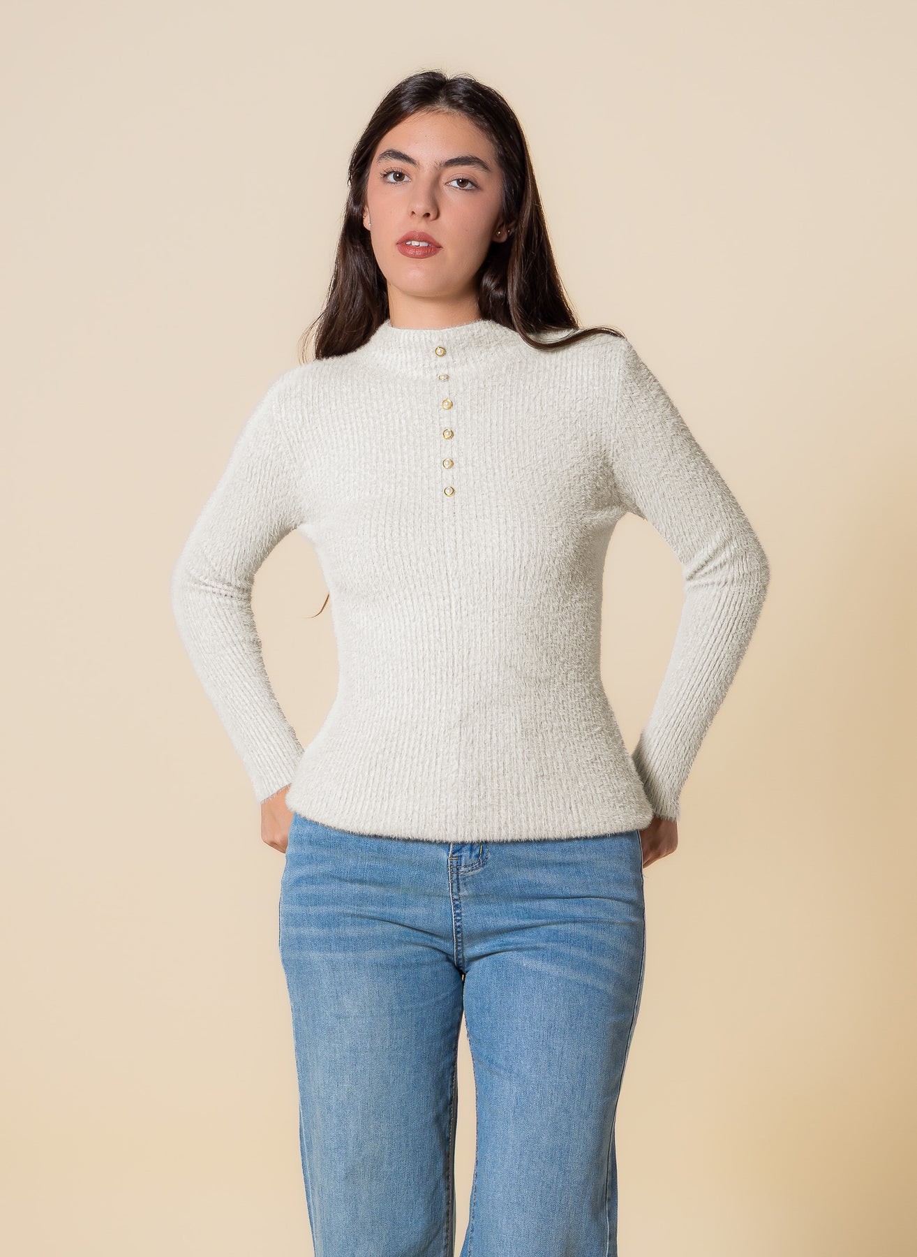 Upgrade your wardrobe with the new Detailed Knit High Neck Top, featuring a chic button design for added style. Crafted for comfort, its soft knit fabric and high neckline provide warmth and elegance. Perfect for dressing up or layering, this top blends fashionable details with everyday ease for a polished look.